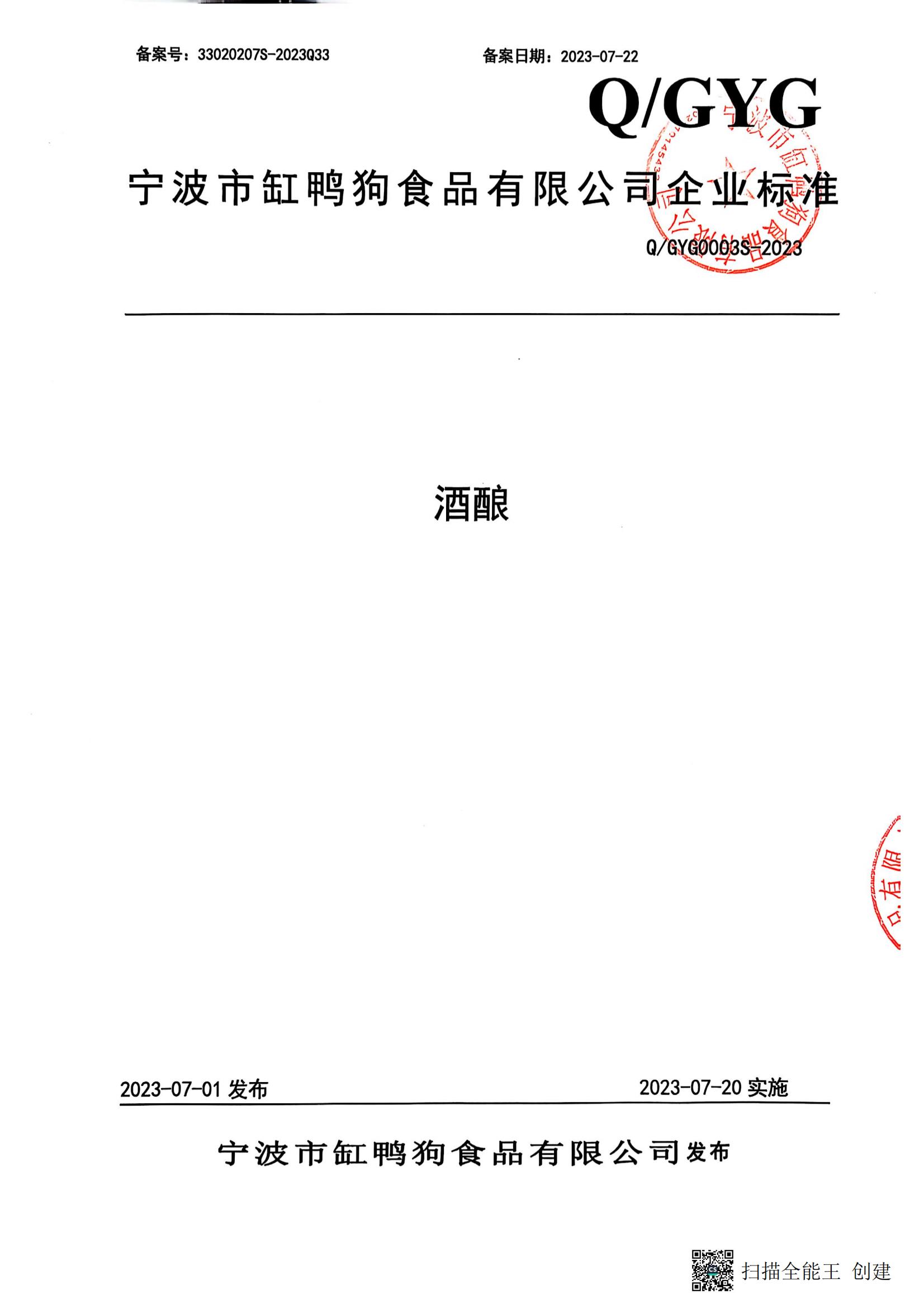 宁波市缸鸭狗食品有限公司企业标准